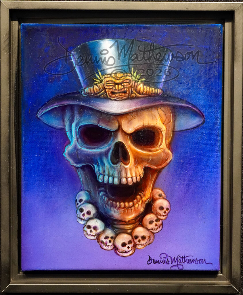 This cool skull wearing an edgy hat, mixed with a hint of island craziness, is a Mathewson original. It’s handprinted with acrylics on canvas and comes framed in a sleek black float frame, all set to hang on your wall. It also includes documents like a certificate of authenticity.